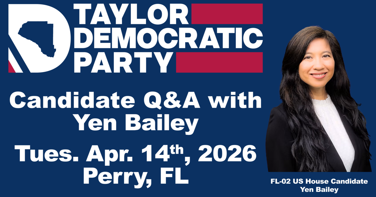 Join the Taylor County Democrats for our April meeting in Perry, FL featuring a candidate Q&A with Yen Bailey, candidate for U.S. House (Florida District 2).